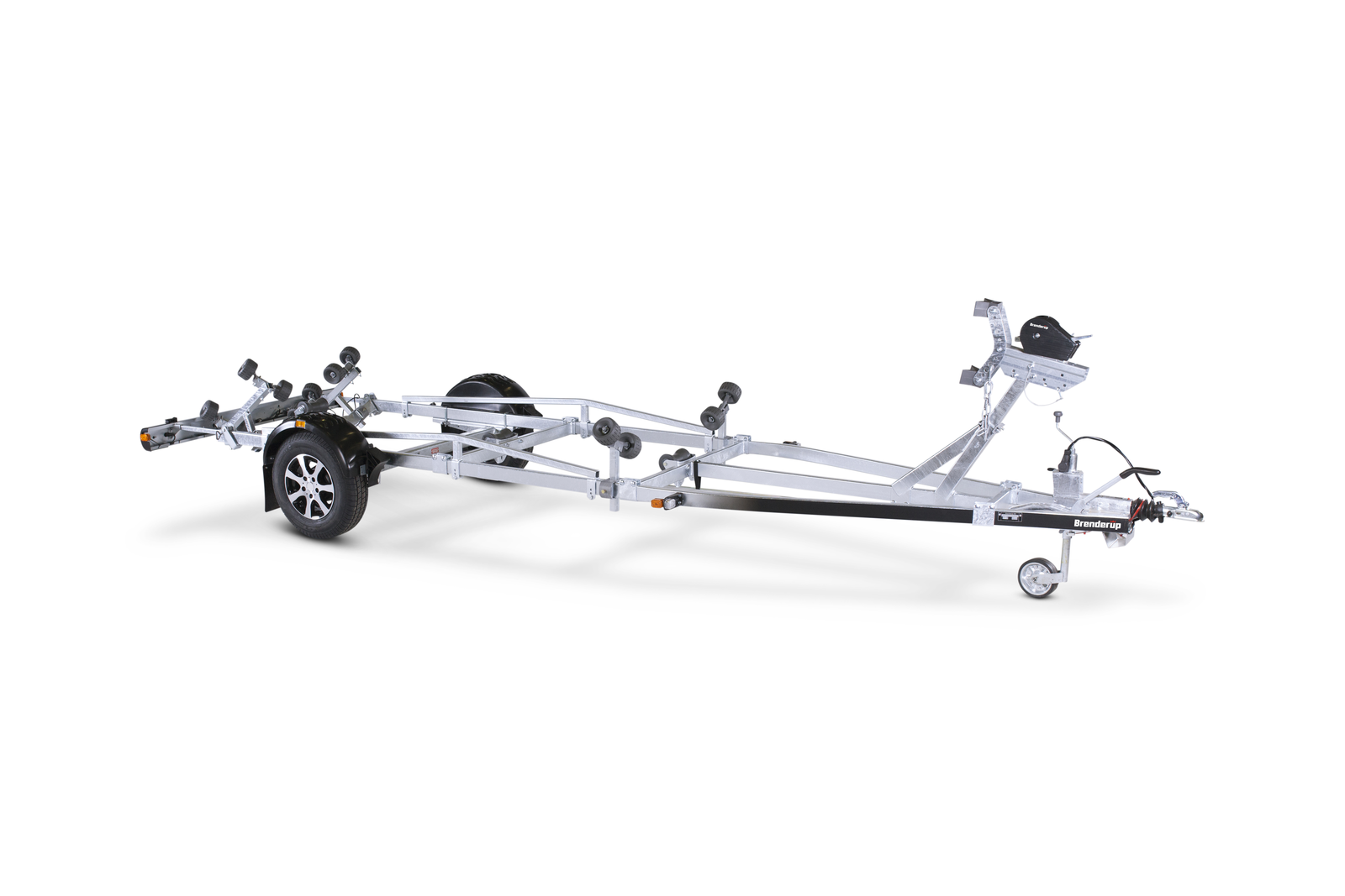 Regulowana wciągarka w połączeniu z regulowanymi rolkami sprawia, że przyczepa pasuje do większości łodzi na rynku.