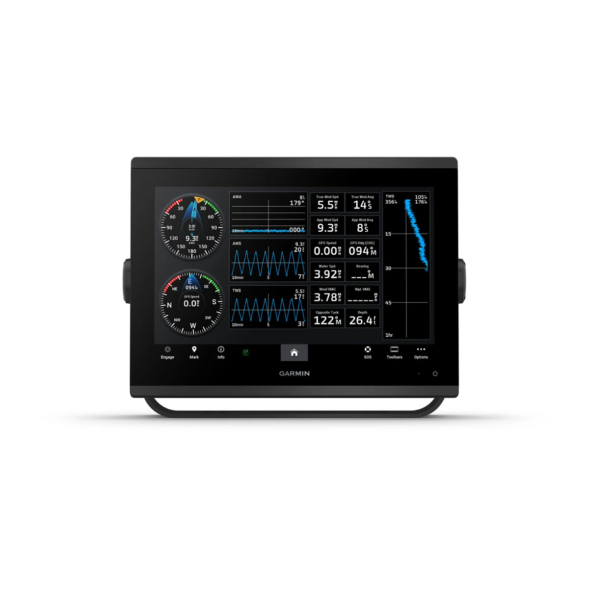 Wyświetlanie linii layline, naprowadzanie na linię startu, ulepszona róża wiatrów, linie kierunku i kursu nad dnem, a także pola z danymi wiatru rzeczywistego, suwak prądu/pływu/godziny, kąt wiatru, kierunek i dryf, prędkość wiatru i wiele innych informacji. - OPCJONALNE, ZAAWANSOWANE FUNKCJE NAWIGACYJNE