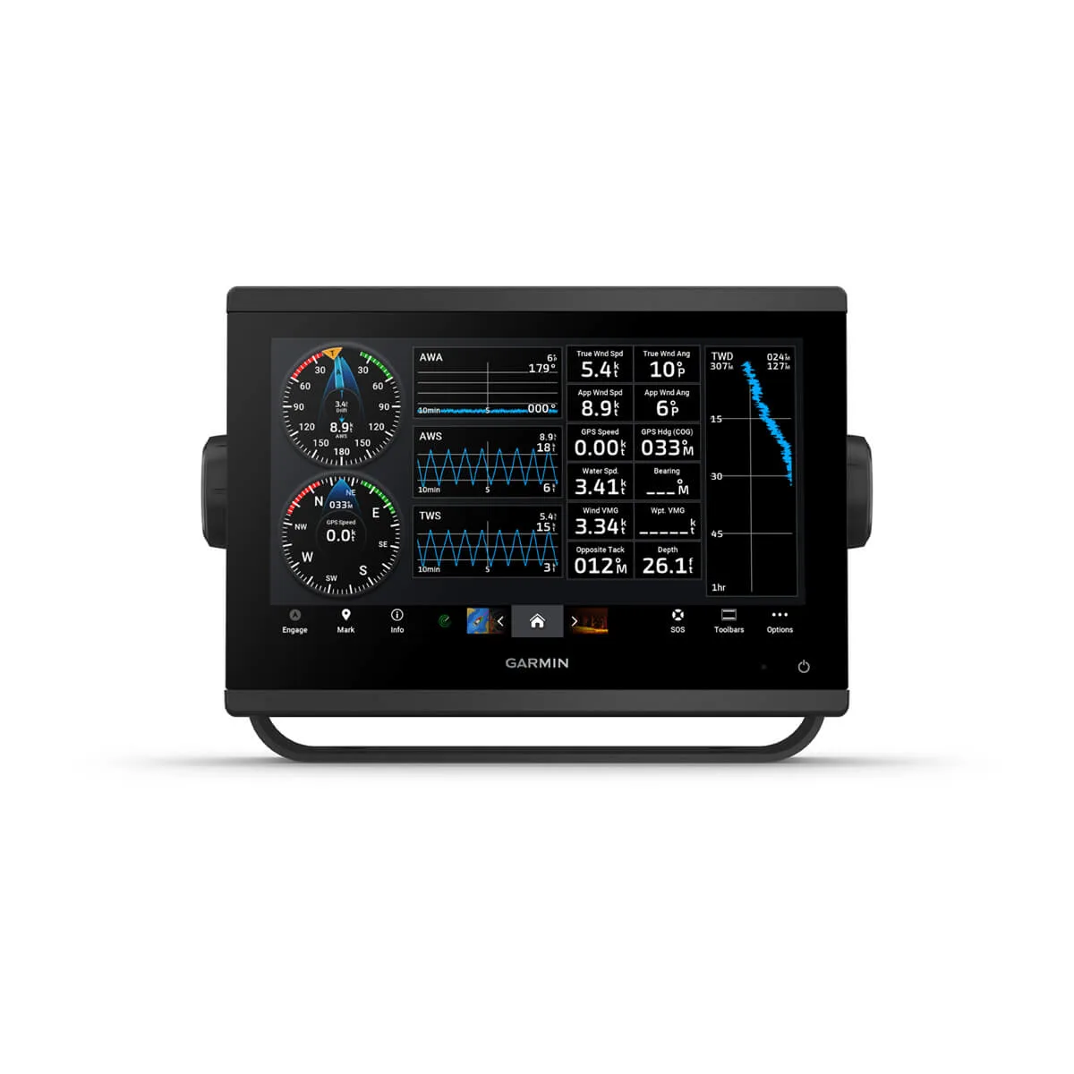 Wyświetlanie linii layline, naprowadzanie na linię startu, ulepszona róża wiatrów, linie kierunku i kursu nad dnem, a także pola z danymi wiatru rzeczywistego, suwak prądu/pływu/godziny, kąt wiatru, kierunek i dryf, prędkość wiatru i wiele innych informacji. - OPCJONALNE, ZAAWANSOWANE FUNKCJE NAWIGACYJNE