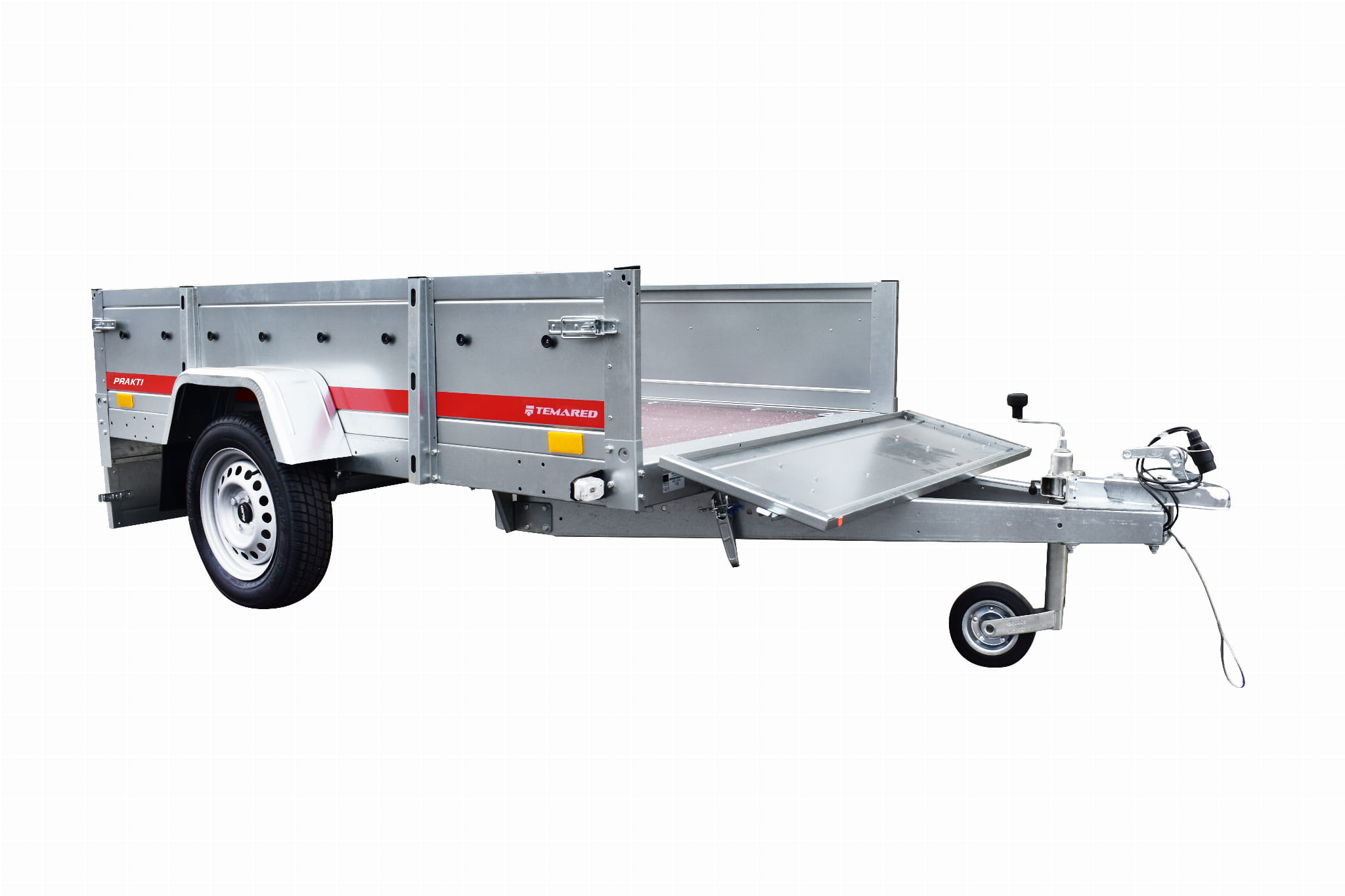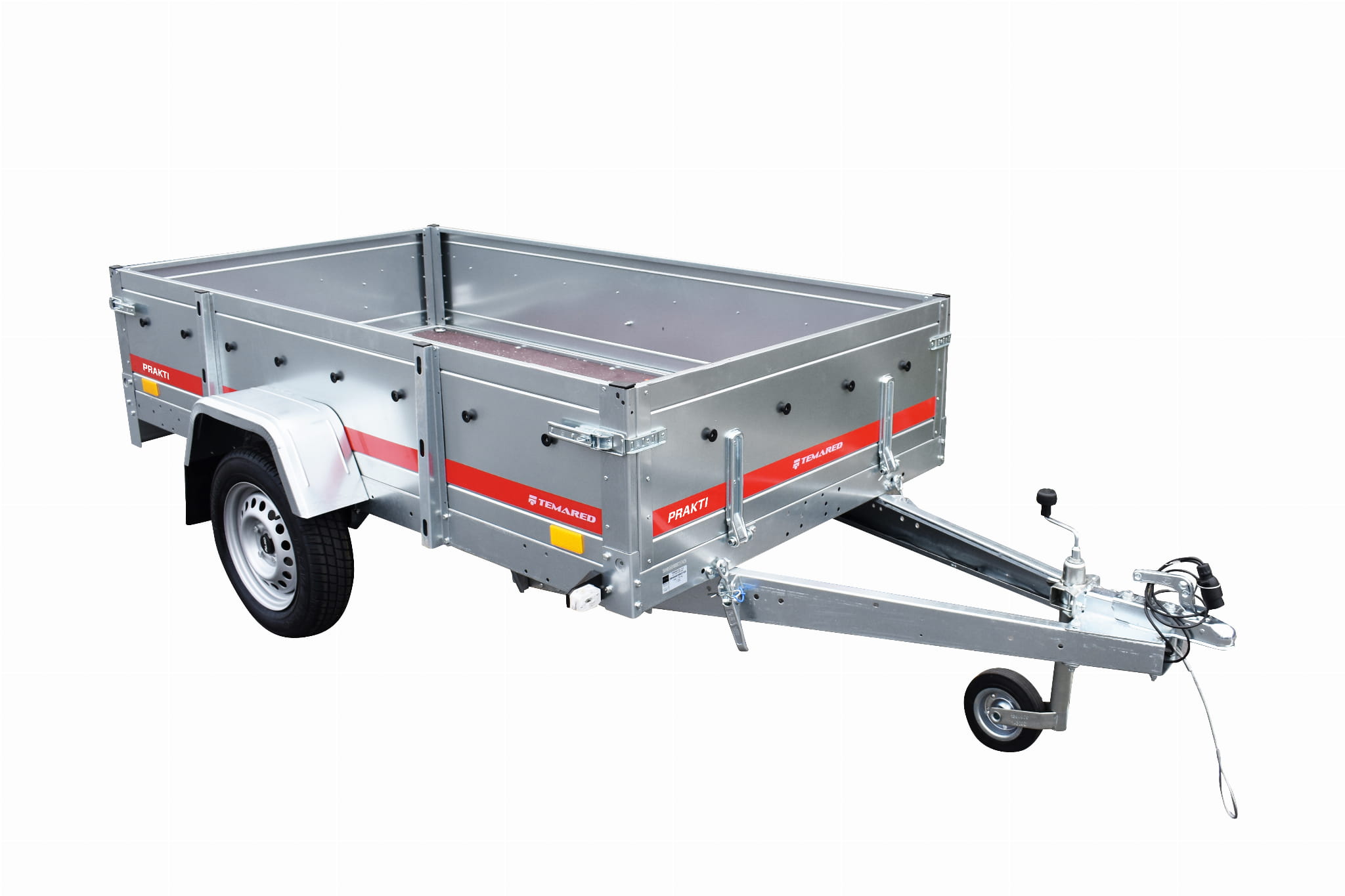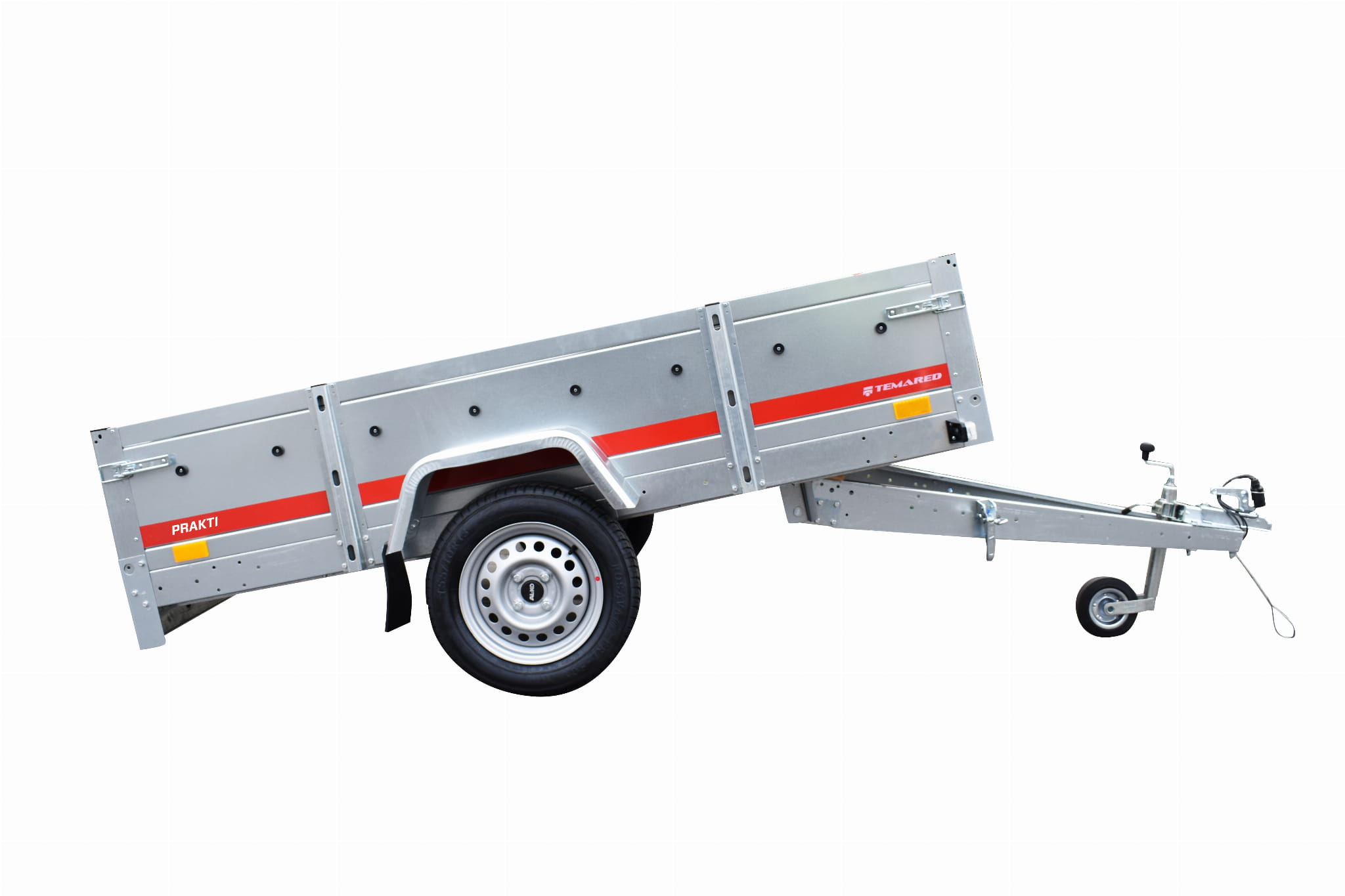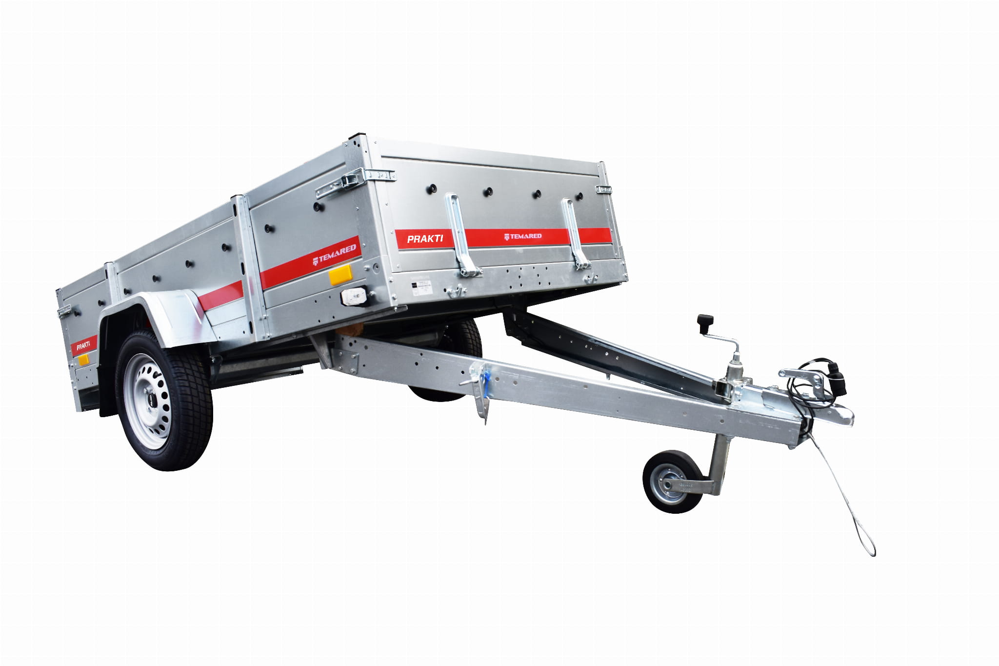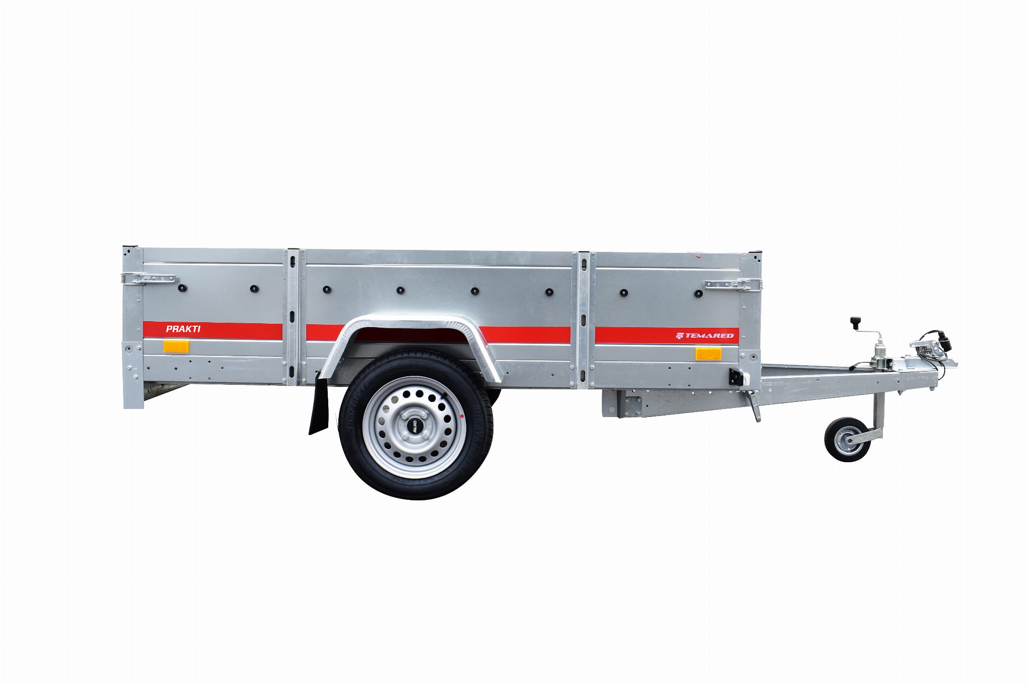 Przyczepy samochodowe serii PRAKTI charakteryzują się uchylnym dyszlem oraz wysoką 46 centymetrową burtą.